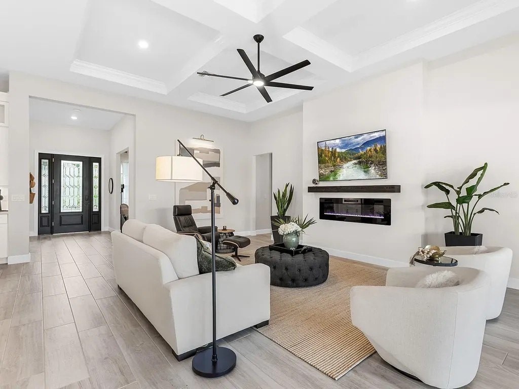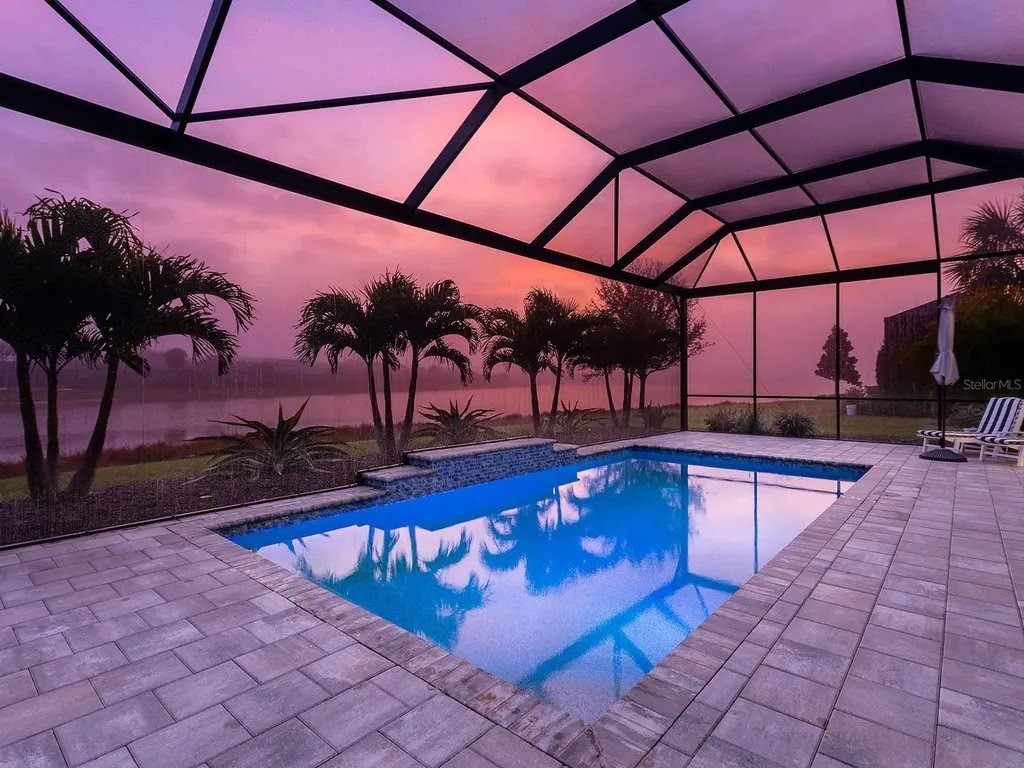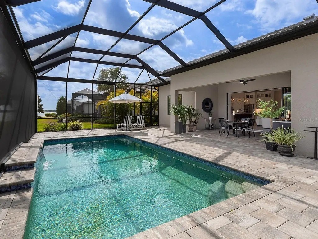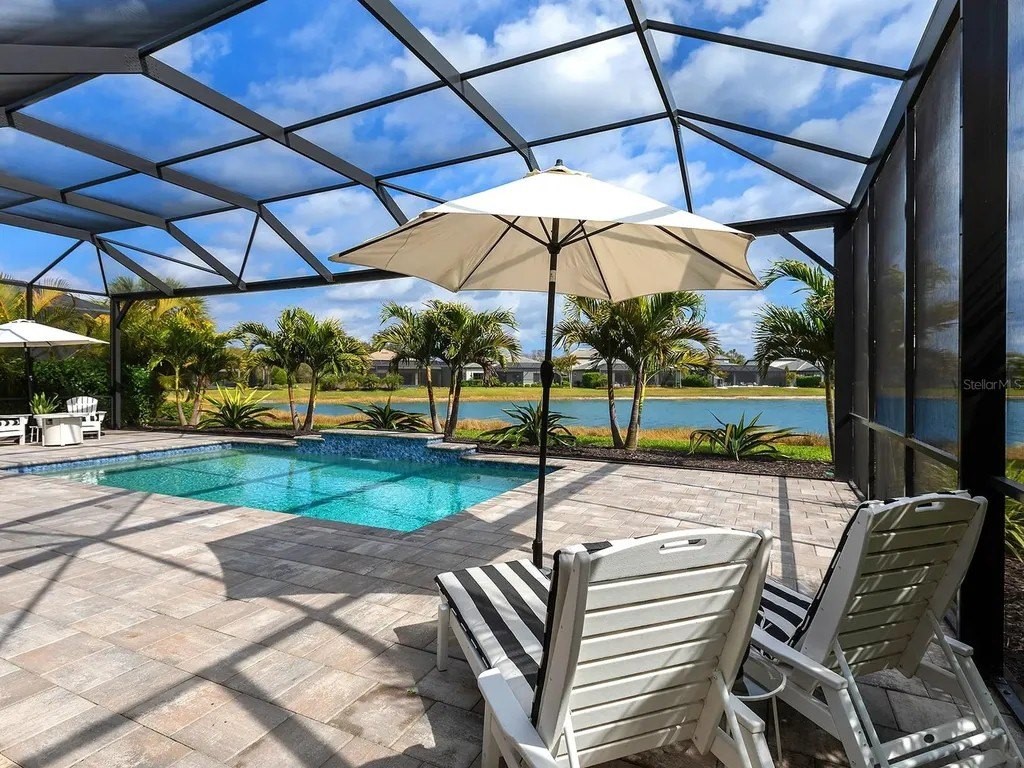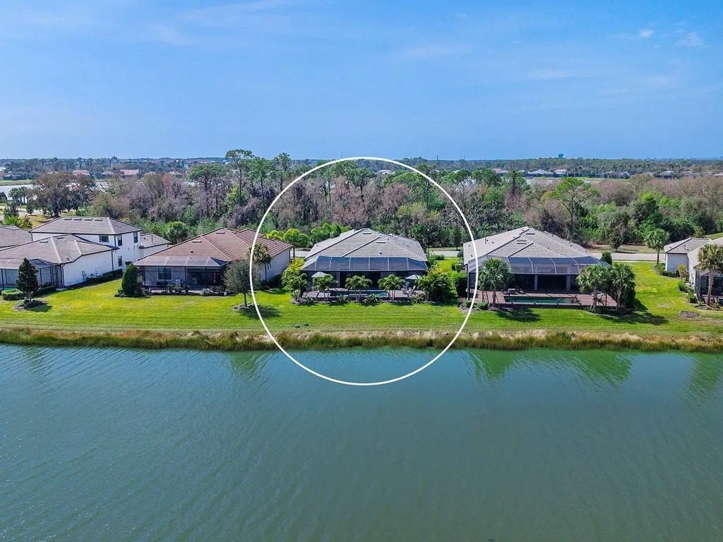Upgraded to perfection, with the ideal location near Waterside Place, and sweeping sunrise lake views is 716 Sigsbee Loop. Built in 2021 by Pulte Homes, this Pinnacle floor plan is one of the most desirable floor plans in the entire Shoreview neighborhood with nearly 2,500 SF of functionality, modern upgrades and comfortable living. You're welcomed home to a bright, light-filled interior where you'll instantly appreciate stunning lake views from the impact-glass front door, soaring ceilings, neutral color palette, plantation shutters and wood-look plank porcelain tile flooring that is throughout the entire residence. The central great room with 12' coffered ceiling and crown molding offers the ideal gathering space around the cozy linear fireplace with wood mantle and a full wall of pocketing sliders that highlight the lake views and are accented by floor-to-ceiling window treatments. The paver lanai will quickly become your favorite space with a northeastern rear exposure that offers beautiful sunrises over the lake and soft sunshine throughout the day. The heated saltwater pool with waterfall feature is perfectly poised lakeside with views framed by the panoramic screen enclosure. In the covered entertaining space is a custom outdoor kitchen outfitted with stainless steel grill and bar fridge and sleek outdoor cabinetry. The open kitchen is defined by modern sensibility and smart style including creamy white cabinetry with extra upper display cabinets, modern pendant lighting, island with counter-height seating and storage, matte suede finish Calacatta quartz counters, walk-in pantry with custom shelving and a stainless-steel KitchenAid appliance suite with gas cooktop. Blending formal experiences with everyday living is the formal dining room with an open flow to the rest of the entertaining spaces and lake views. The flex room at the front of the home offers extra convenience and can be used to suit your lifestyle as a study, formal living or dining space, hobby room and more. Enjoy elegant relaxation in the primary suite with wood feature wall, large windows showcasing the lake views, en-suite bathroom with an extra long vanity with dual sinks, large frameless enclosure walk-in shower and a dream walk-in closet with custom shelving. Guests will find equal comfort in the two guest bedrooms, one of which includes a private en-suite bathroom, and are privately located on separate sides of the home. The laundry offers the ultimate functionality with storage cabinetry, utility sink, built-in mudroom bench, and barn-style door. Don't forget about the 3-car garage that is fully equipped with its own AC mini-split system so it stays cool year-round, storage racks, and epoxy floor. Peace of mind is secured with Leaf whole-house water filtration system, in-wall pest defense system and smart home pre-wire. Just steps away from your front door is a walking trail surrounded on both sides by lakes that leads straight to the amenities and clubhouse in less than 5 minutes. Shoreview at Waterside features 144 acres of lakes, clubhouse with gathering space, kayak launch, beach area, lighted tennis and pickleball courts, events lawn, and fitness center. Located just minutes from Waterside you are a short distance of shopping, dining, farmers market, parks, events and more, while maintaining proximity to all Sarasota has to offer including world-class beaches. Lakewood Ranch is the top multi-generational community in the country for 8 years in a row!