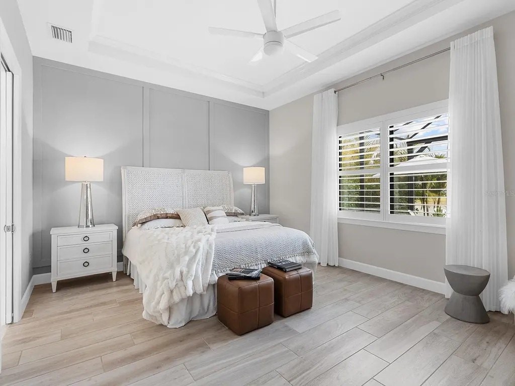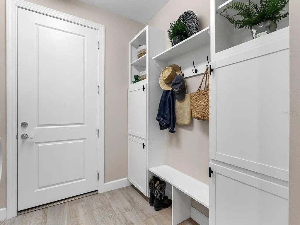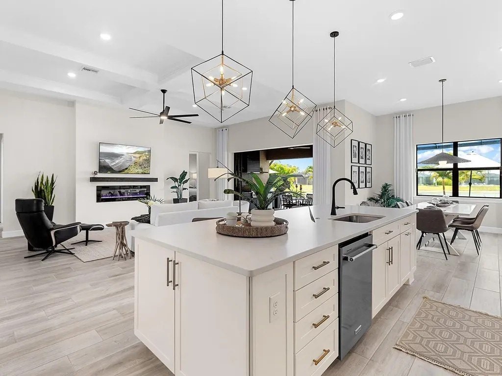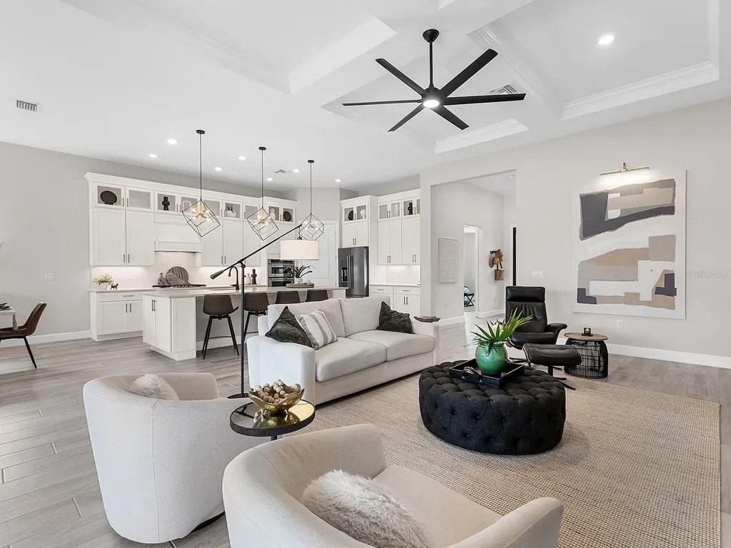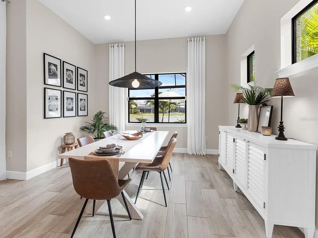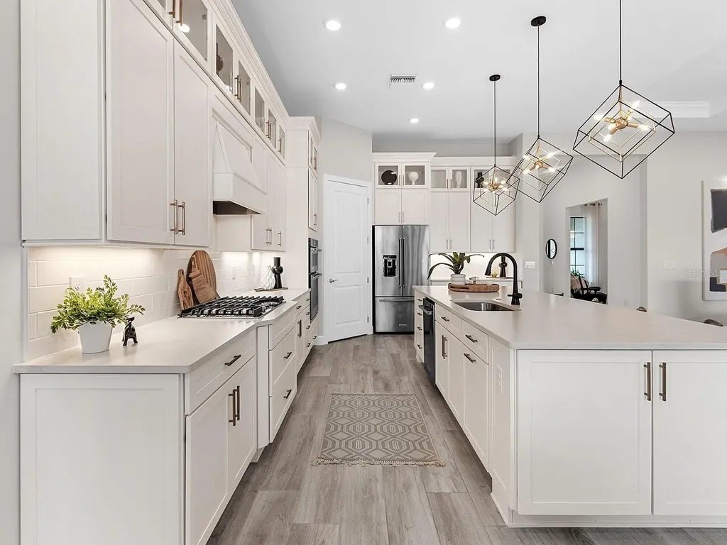 Upgraded to perfection, with the ideal location near Waterside Place, and sweeping sunrise lake views is 716 Sigsbee Loop. Built in 2021 by Pulte Homes, this Pinnacle floor plan is one of the most desirable floor plans in the entire Shoreview neighborhood with nearly 2,500 SF of functionality, modern upgrades and comfortable living. You're welcomed home to a bright, light-filled interior where you'll instantly appreciate stunning lake views from the impact-glass front door, soaring ceilings, neutral color palette, plantation shutters and wood-look plank porcelain tile flooring that is throughout the entire residence. The central great room with 12' coffered ceiling and crown molding offers the ideal gathering space around the cozy linear fireplace with wood mantle and a full wall of pocketing sliders that highlight the lake views and are accented by floor-to-ceiling window treatments. The paver lanai will quickly become your favorite space with a northeastern rear exposure that offers beautiful sunrises over the lake and soft sunshine throughout the day. The heated saltwater pool with waterfall feature is perfectly poised lakeside with views framed by the panoramic screen enclosure. In the covered entertaining space is a custom outdoor kitchen outfitted with stainless steel grill and bar fridge and sleek outdoor cabinetry. The open kitchen is defined by modern sensibility and smart style including creamy white cabinetry with extra upper display cabinets, modern pendant lighting, island with counter-height seating and storage, matte suede finish Calacatta quartz counters, walk-in pantry with custom shelving and a stainless-steel KitchenAid appliance suite with gas cooktop. Blending formal experiences with everyday living is the formal dining room with an open flow to the rest of the entertaining spaces and lake views. The flex room at the front of the home offers extra convenience and can be used to suit your lifestyle as a study, formal living or dining space, hobby room and more. Enjoy elegant relaxation in the primary suite with wood feature wall, large windows showcasing the lake views, en-suite bathroom with an extra long vanity with dual sinks, large frameless enclosure walk-in shower and a dream walk-in closet with custom shelving. Guests will find equal comfort in the two guest bedrooms, one of which includes a private en-suite bathroom, and are privately located on separate sides of the home. The laundry offers the ultimate functionality with storage cabinetry, utility sink, built-in mudroom bench, and barn-style door. Don't forget about the 3-car garage that is fully equipped with its own AC mini-split system so it stays cool year-round, storage racks, and epoxy floor. Peace of mind is secured with Leaf whole-house water filtration system, in-wall pest defense system and smart home pre-wire. Just steps away from your front door is a walking trail surrounded on both sides by lakes that leads straight to the amenities and clubhouse in less than 5 minutes. Shoreview at Waterside features 144 acres of lakes, clubhouse with gathering space, kayak launch, beach area, lighted tennis and pickleball courts, events lawn, and fitness center. Located just minutes from Waterside you are a short distance of shopping, dining, farmers market, parks, events and more, while maintaining proximity to all Sarasota has to offer including world-class beaches. Lakewood Ranch is the top multi-generational community in the country for 8 years in a row!