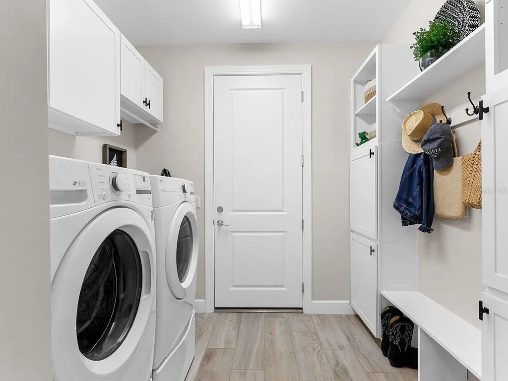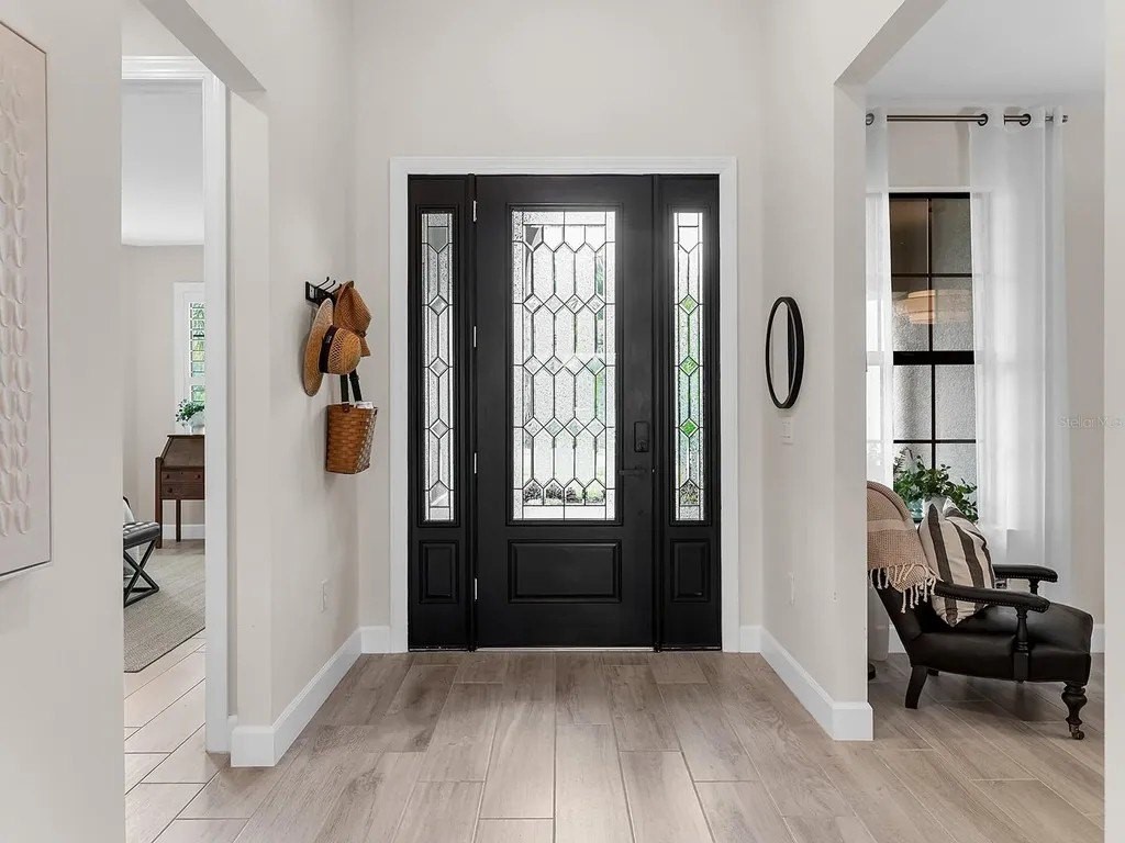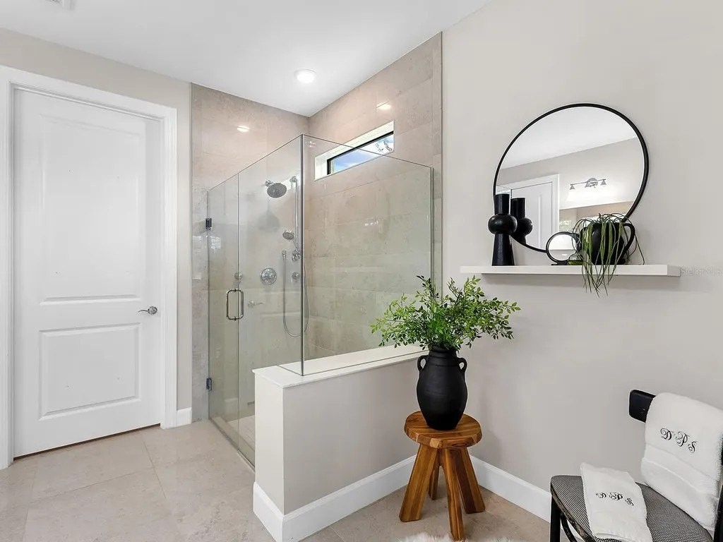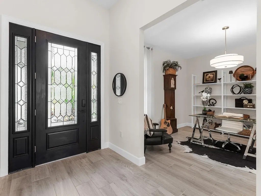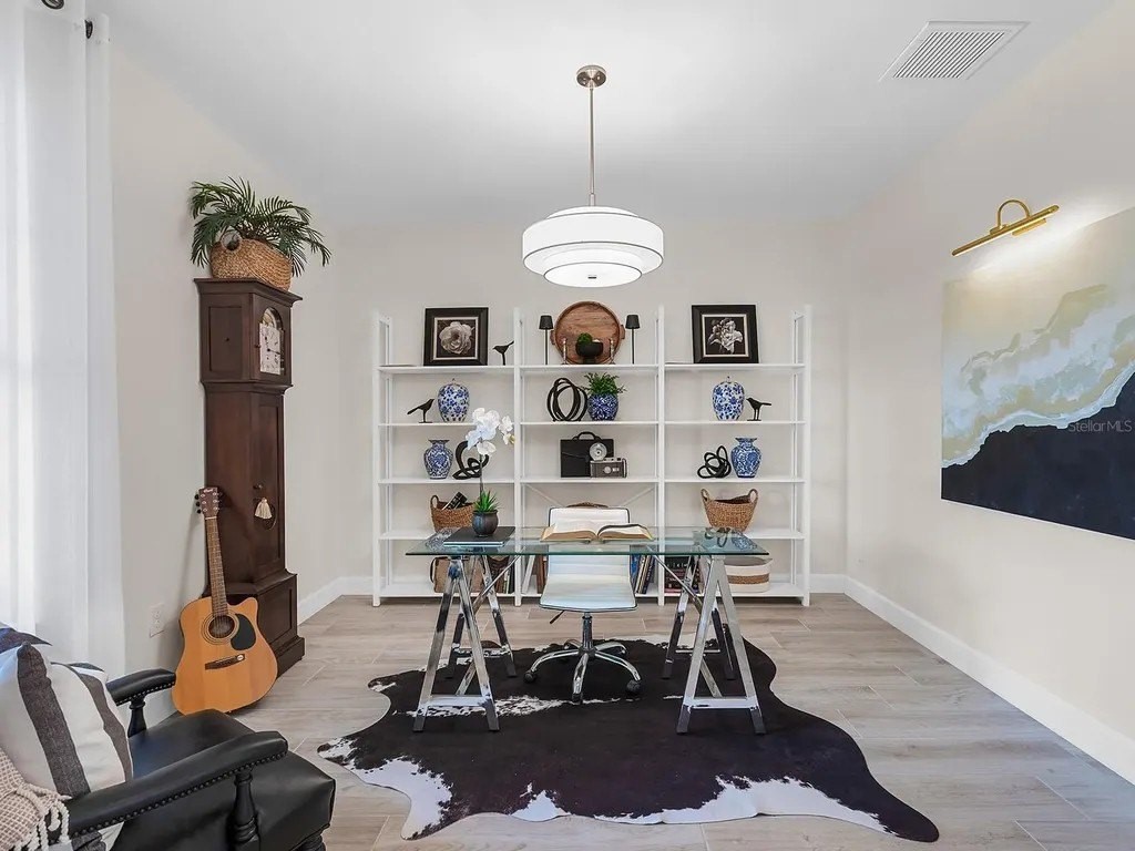 Upgraded to perfection, with the ideal location near Waterside Place, and sweeping sunrise lake views is 716 Sigsbee Loop. Built in 2021 by Pulte Homes, this Pinnacle floor plan is one of the most desirable floor plans in the entire Shoreview neighborhood with nearly 2,500 SF of functionality, modern upgrades and comfortable living. You're welcomed home to a bright, light-filled interior where you'll instantly appreciate stunning lake views from the impact-glass front door, soaring ceilings, neutral color palette, plantation shutters and wood-look plank porcelain tile flooring that is throughout the entire residence. The central great room with 12' coffered ceiling and crown molding offers the ideal gathering space around the cozy linear fireplace with wood mantle and a full wall of pocketing sliders that highlight the lake views and are accented by floor-to-ceiling window treatments. The paver lanai will quickly become your favorite space with a northeastern rear exposure that offers beautiful sunrises over the lake and soft sunshine throughout the day. The heated saltwater pool with waterfall feature is perfectly poised lakeside with views framed by the panoramic screen enclosure. In the covered entertaining space is a custom outdoor kitchen outfitted with stainless steel grill and bar fridge and sleek outdoor cabinetry. The open kitchen is defined by modern sensibility and smart style including creamy white cabinetry with extra upper display cabinets, modern pendant lighting, island with counter-height seating and storage, matte suede finish Calacatta quartz counters, walk-in pantry with custom shelving and a stainless-steel KitchenAid appliance suite with gas cooktop. Blending formal experiences with everyday living is the formal dining room with an open flow to the rest of the entertaining spaces and lake views. The flex room at the front of the home offers extra convenience and can be used to suit your lifestyle as a study, formal living or dining space, hobby room and more. Enjoy elegant relaxation in the primary suite with wood feature wall, large windows showcasing the lake views, en-suite bathroom with an extra long vanity with dual sinks, large frameless enclosure walk-in shower and a dream walk-in closet with custom shelving. Guests will find equal comfort in the two guest bedrooms, one of which includes a private en-suite bathroom, and are privately located on separate sides of the home. The laundry offers the ultimate functionality with storage cabinetry, utility sink, built-in mudroom bench, and barn-style door. Don't forget about the 3-car garage that is fully equipped with its own AC mini-split system so it stays cool year-round, storage racks, and epoxy floor. Peace of mind is secured with Leaf whole-house water filtration system, in-wall pest defense system and smart home pre-wire. Just steps away from your front door is a walking trail surrounded on both sides by lakes that leads straight to the amenities and clubhouse in less than 5 minutes. Shoreview at Waterside features 144 acres of lakes, clubhouse with gathering space, kayak launch, beach area, lighted tennis and pickleball courts, events lawn, and fitness center. Located just minutes from Waterside you are a short distance of shopping, dining, farmers market, parks, events and more, while maintaining proximity to all Sarasota has to offer including world-class beaches. Lakewood Ranch is the top multi-generational community in the country for 8 years in a row!